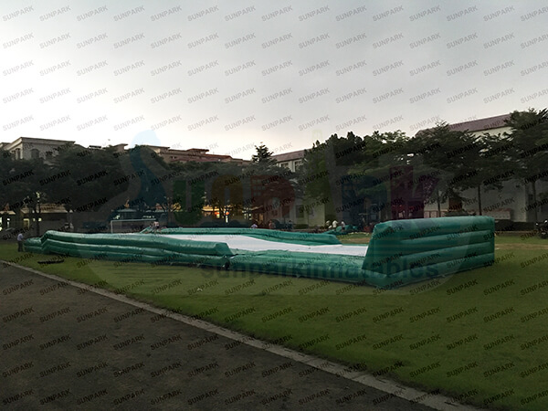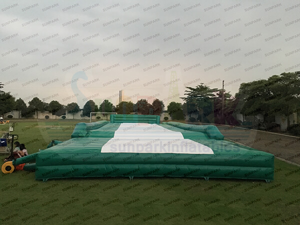 This green Snowboard Airbag Training system features two sturdy sections connected by a flap system that creates a smooth, gap-free landing surface. Its seamless design ensures stability and safety, providing confidence for every jump.